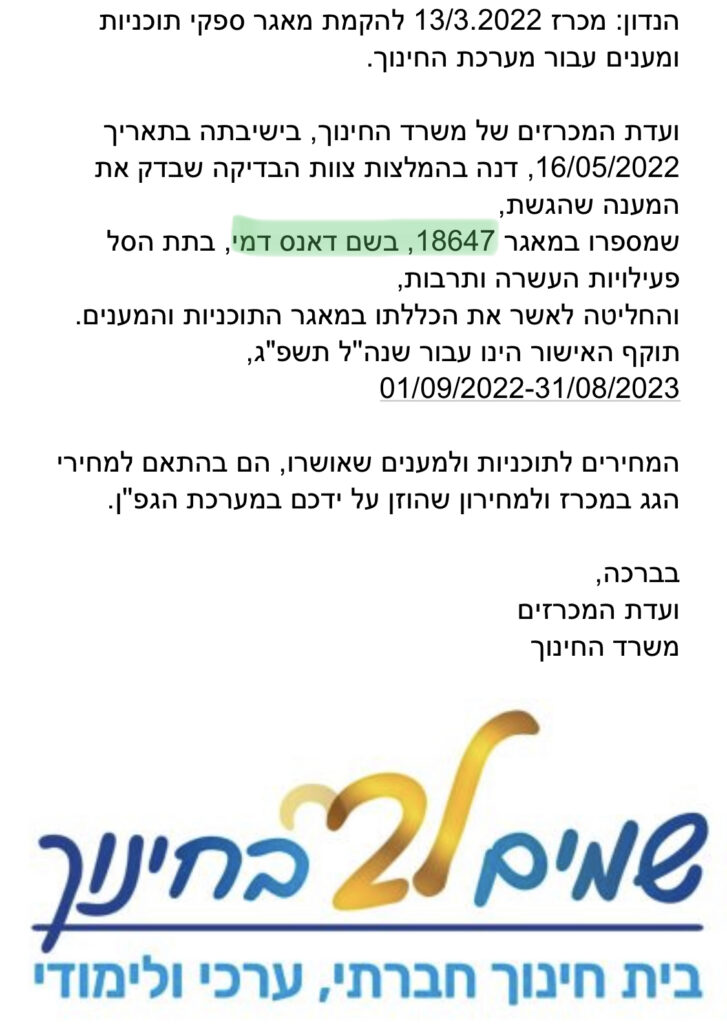 אישור משרד החינוך על תכניות דאנס דמי כחלק מפרויקט גפ״ן